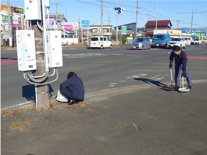 写真は、店舗がある国道152号線通りの交差点付近です。この日は草取りとごみ拾いを行いました。