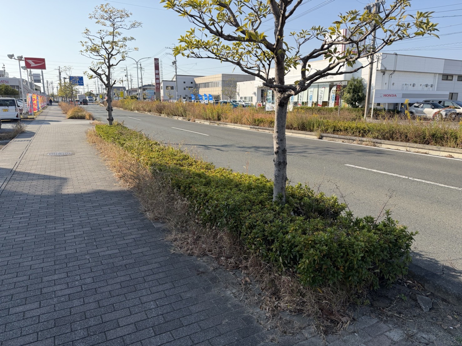店舗の側道から大通りにかけて背の高い草が生い茂っており、